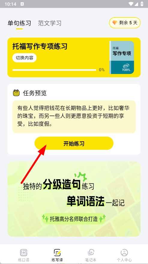 2、进入托福写作专项练习页,点击开始练习,开启练习任务。