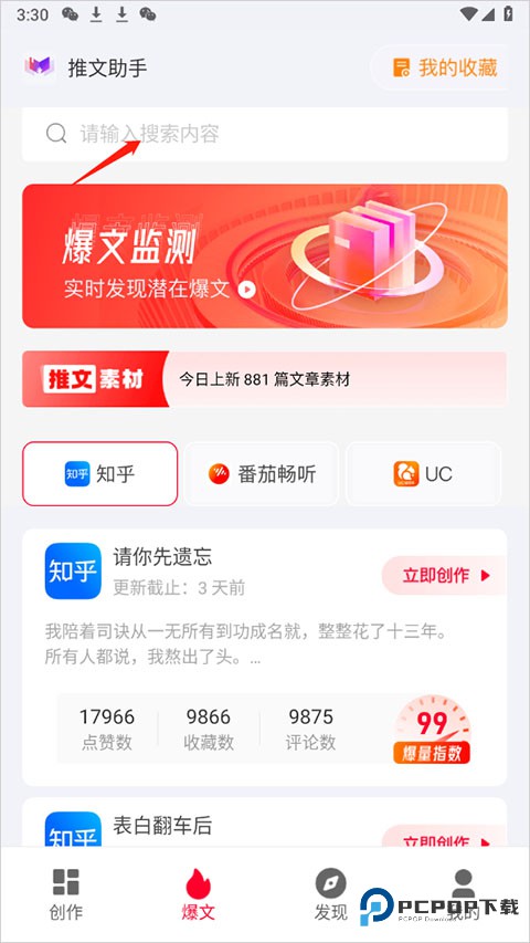 1、打开推文助手的官方 app 吧,一启动就看到首页啦,立刻点顶部的搜索框启动第一步。