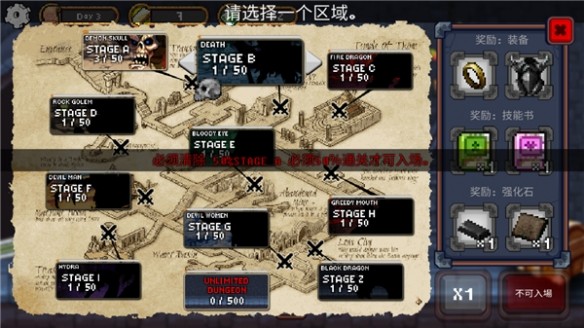 2、击败当前区域50%的敌人后,可以解锁下一个区域进行挑战。