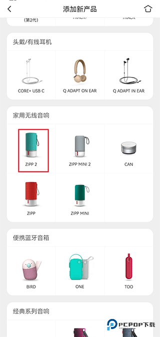 进入设备选择页面后,在产品列表中选中需要连接的蓝牙音箱具体型号,本文以Zipp 2型号为例演示操作流程。