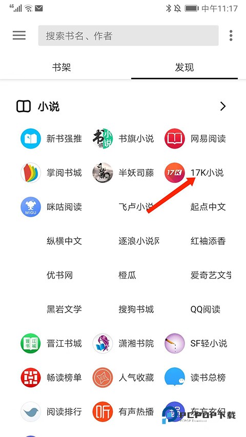 3、进入发现界面,可看到包括新手强推、书旗小说、网易阅读、掌阅书城、17K小说等等小说平台,用户可根据自己的喜欢选择相应的小说平台,这里以17K小说为例,