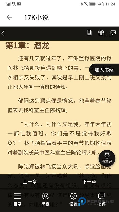 5、在阅读界面,包括选择章节、设置模式、加入书架、查看书评、写章评等功能,
