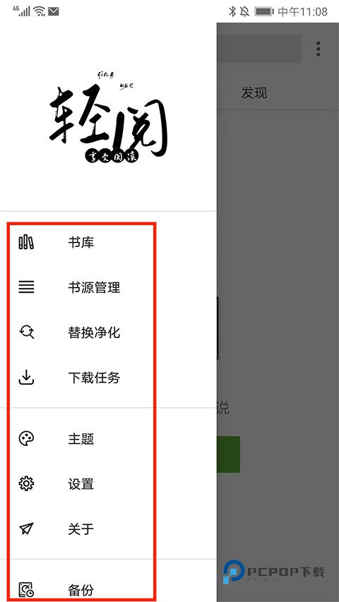 6、进入菜单界面,包括书库、书源管理、替换净化、下载任务、主题、设置等选项,用户可根据需求进行选择使用,以上就是轻阅app官方版的使用方法了。