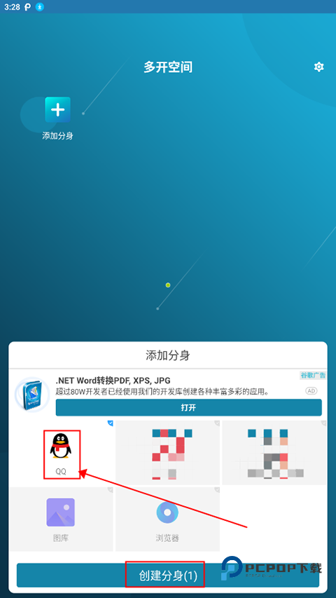 2、在弹框中选择要添加的应用,点击“创建分身”;