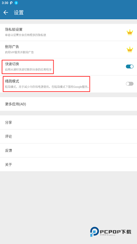 4、也可以在设置里面启动快速切换和精简模式;