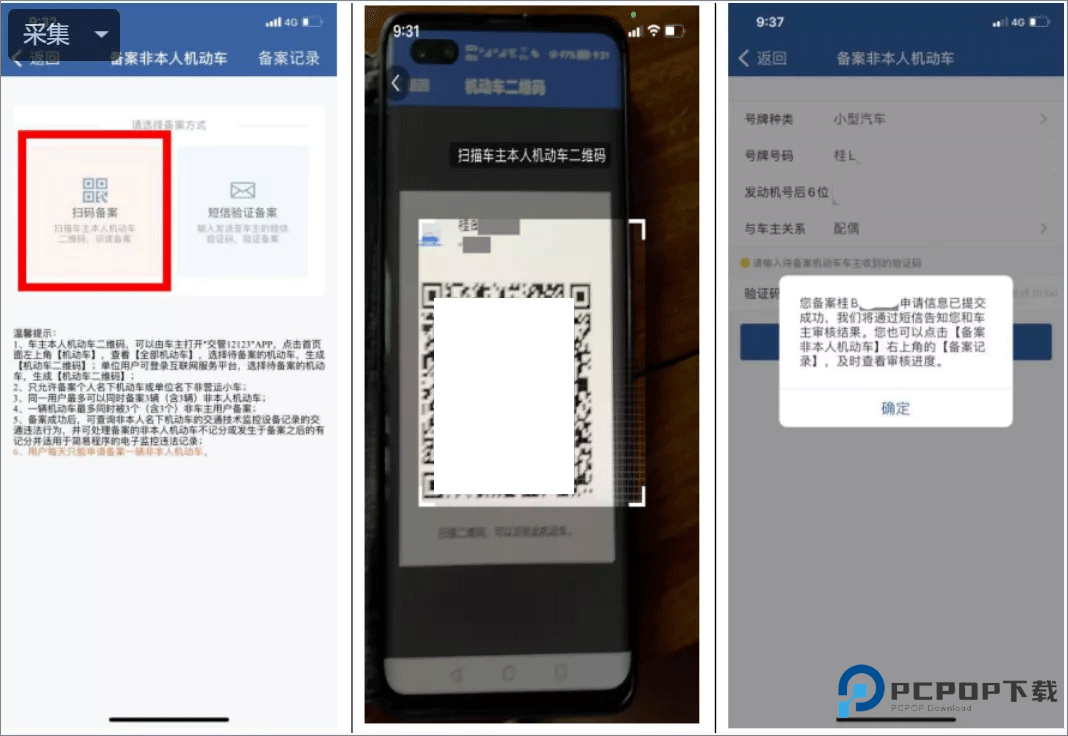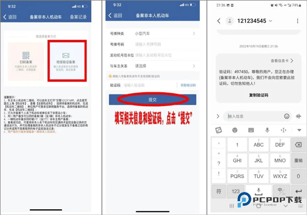 5、采用“短信验证备案”的,用户输入需要备案的非本人机动车的号牌种类、号牌号码、发动机号后六位等信息后,系统将发送短信验证码至车主手机号码(车主可以是非互联网平台注册用户),申请用户输入车主收到短信验证码。短信验证码验证通过后,选择与车主关系,提交备案申请。