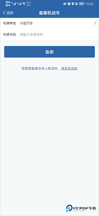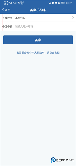 2、然后输入车牌号码并点击备案即可备案机动车,若需要备案非本人机动车时,点击此处。