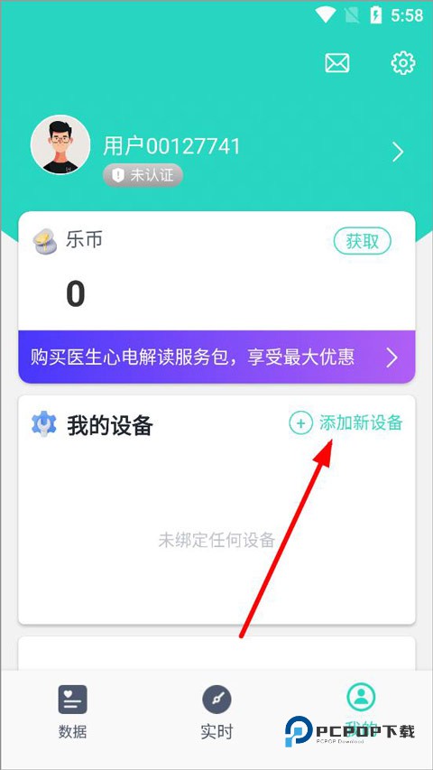 3、进入我的页面可以看到用户基本信息、乐币、我的设备,点击添加新设备。