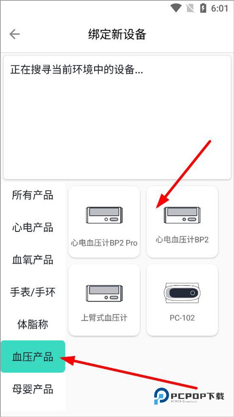 4、绑定设备页面有可绑定设备的分类,包括心电产品、血氧产品、手表/手环、体脂秤等,点击血压产品,选择心电血压计型号。