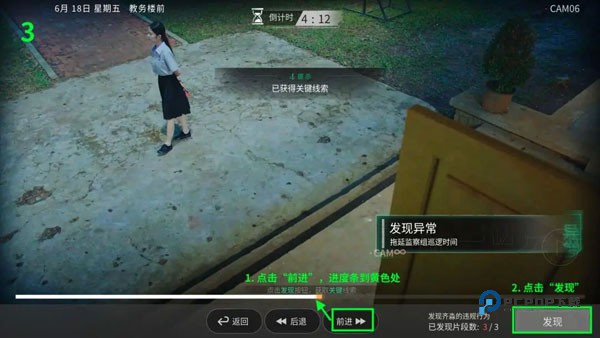 在1食堂、2后山、3教五楼前分别发现三个异常,点击“前进”按钮快进到齐淼违规处,点击“发现”按钮