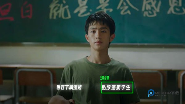 然后点击“跳过”剧情,直到杨校长询问齐淼的违规行为,选择举报“私放违规学生”