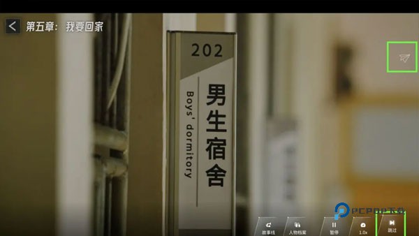 然后点击“跳过”剧情,直到右上角出现“纸飞机”存档图标:
