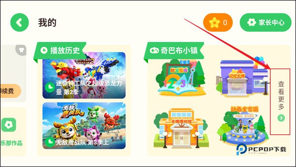 2、在个人界面往左滑找到奇巴布小镇,点击【查看更多】