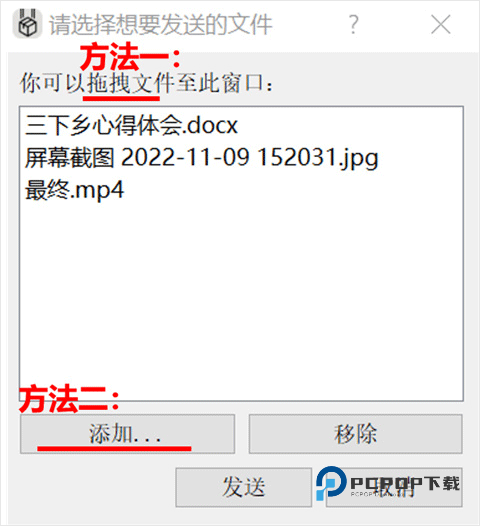 1、首先在电脑端我们将要发送的文件拖到窗口或者按左下角的“添加”按钮,然后点击“发送”。