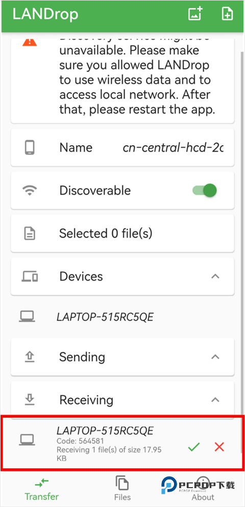 3、之后手机的软件界面会在【Receiving】栏弹出一个电脑发来的握手标志,点击“√”,电脑就会自动将文件传输至手机上。