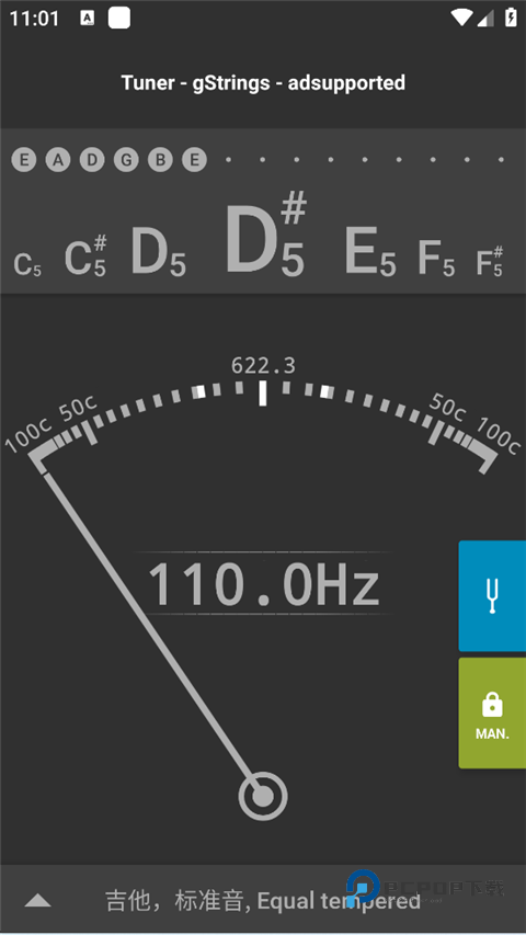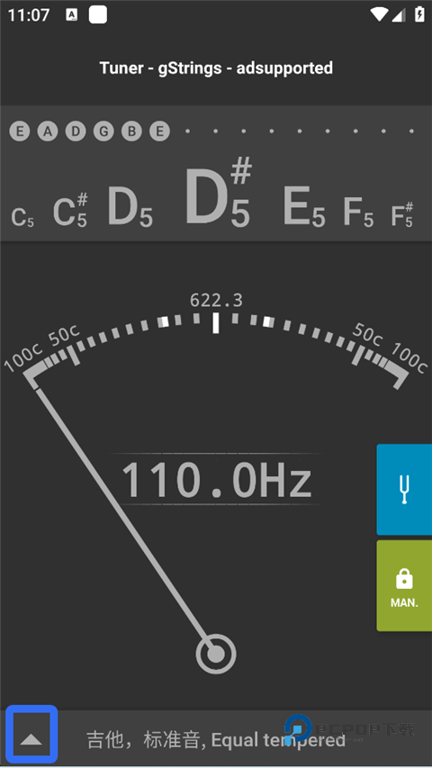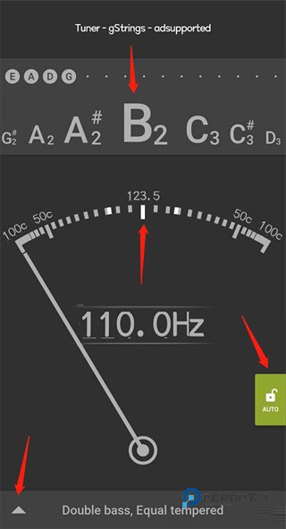 1、打开gStrings调音器软件后,要确保界面右下角的“Auto”,这个键是绿色亮起的状态。检测是否进入了“AUTO”模式很简单,对着手机吼一嗓子,如果指针持续来回晃动就对了。
