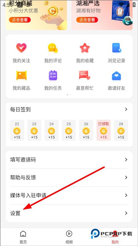 2、进入用户中心页面,用户可查看积分、优惠券、关注、评论、收藏、浏览记录等,下拉找到设置;