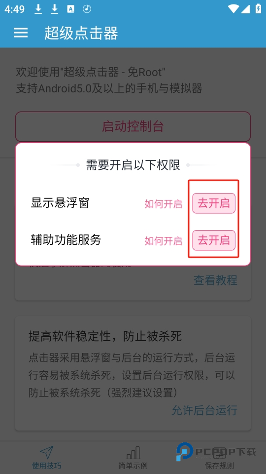1、打开超级点击器app,通常会提示需要开通显示悬浮窗”功能和辅助功能权限。根据系统提示,将这两个权限设置为允许或打开状态