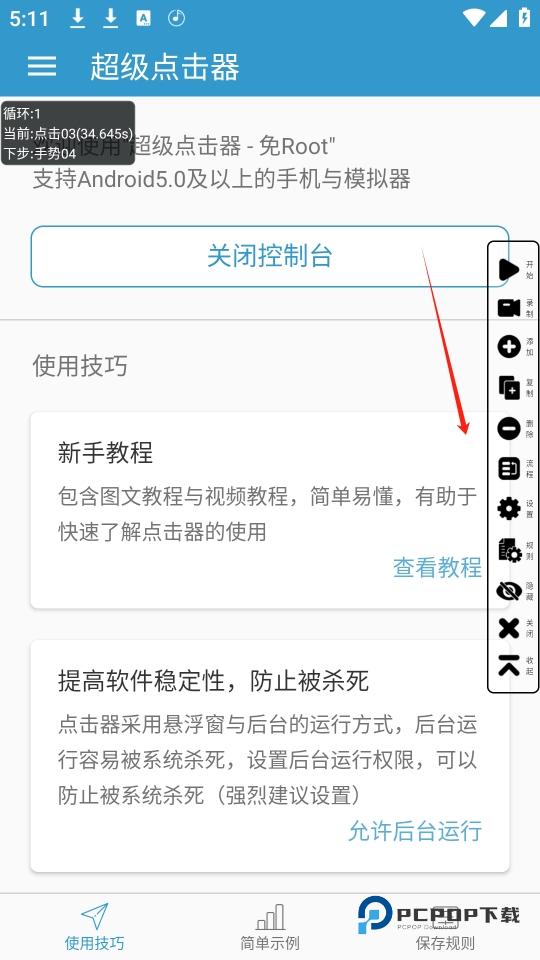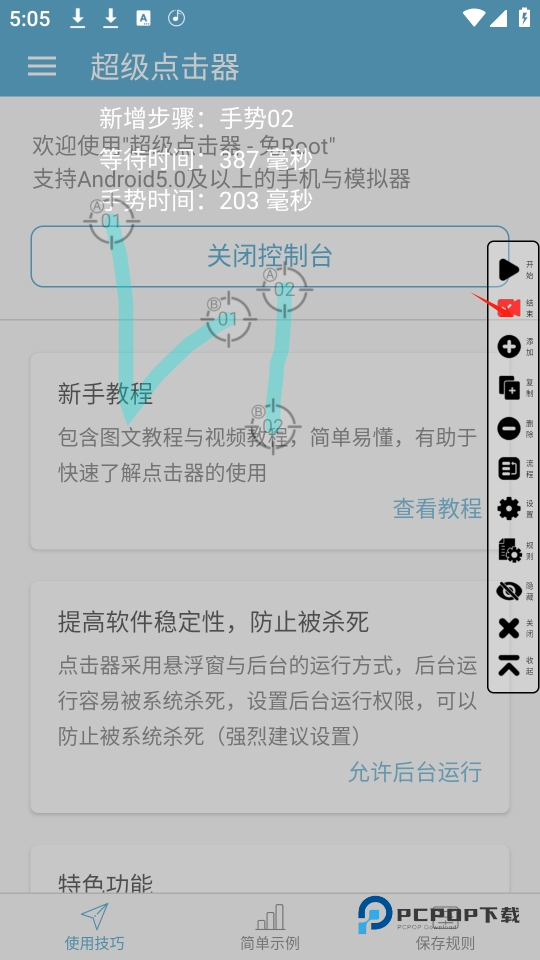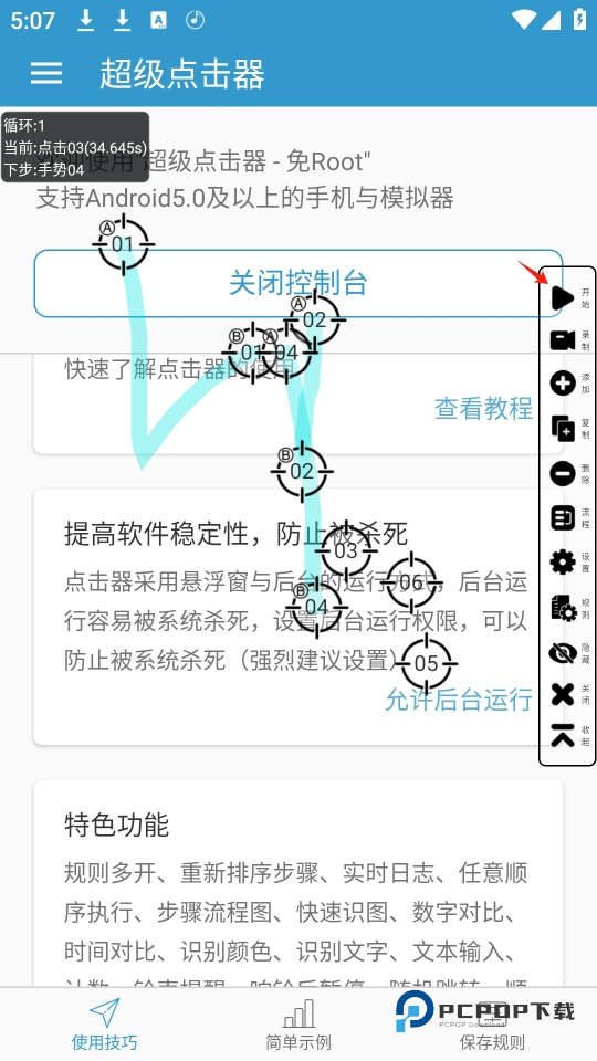 5、完成上述设置后,点击悬浮窗中的开始按钮,超级点击器就会按照设定的步骤和参数自动执行点击或其他操作