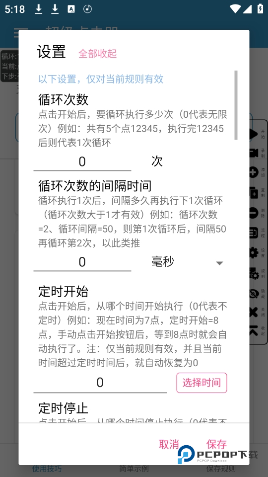 4、根据需求,可以点击设置选项,编辑循环操作的次数、每次操作的间隔时间、定时启动或停止时间等参数