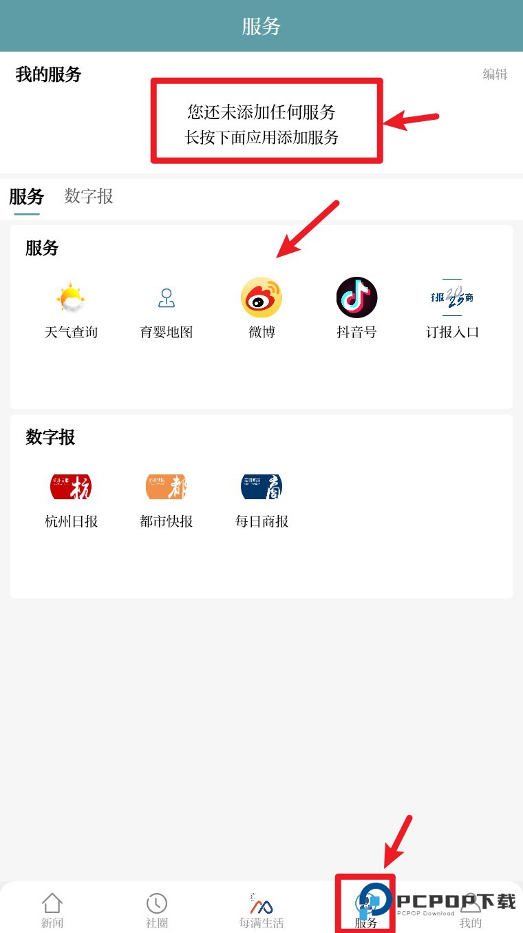 5. 点击底部“服务”模块可添加天气、微博、抖音号等服务,同时支持查阅数字报。