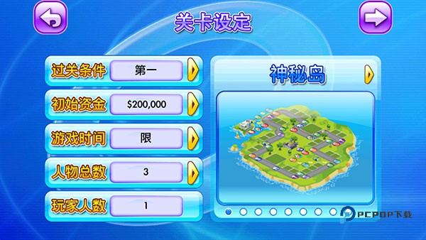 2、在关卡设定界面对游戏时间、人物总数、初始资金进行设定后,点击→进到下一步。