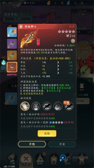 3.华丽的法宝养成体系,从上古神器到本命灵宝,每件法宝不仅拥有独特的外观,还附带了能扭转乾坤的特殊技能,是战斗中的关键变数。
