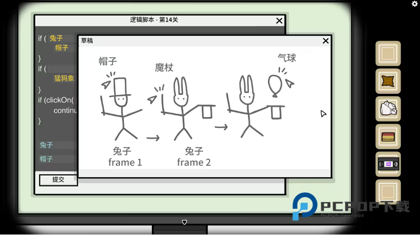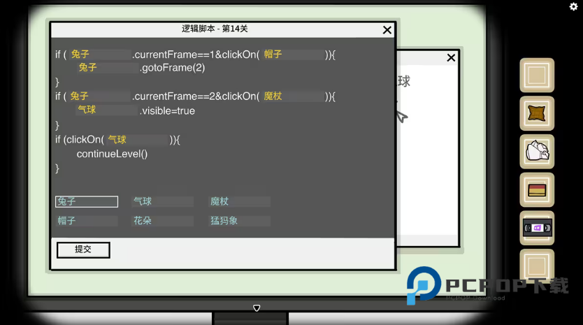 clickOn()判断玩家按了哪个物体,按照流程首先按的是帽子,然后是魔杖,最后按的是气球