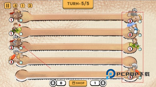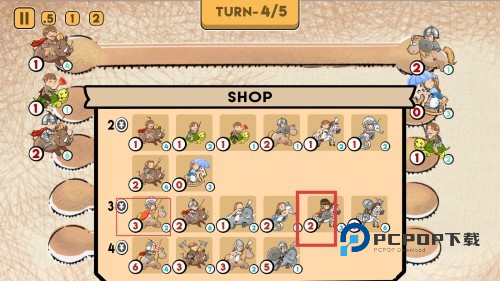3、到【/5】时,进入【SHOP】界面,挑选合适的兵种单位,合理搭配来增强战力。