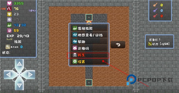 7、当你在探索的时候发现已经打不过任何敌人了,我们可以点击设置选择转生结束这次冒险,然后用结算获得的灵魂升级你的初始属性