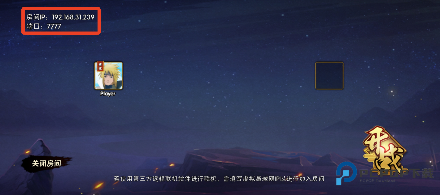 3、在左上角可以看到房间IP和端口号码,记住这些号码。
