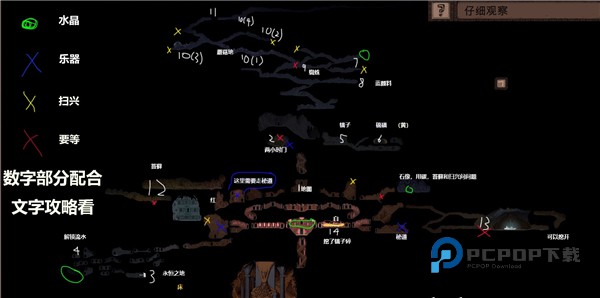 开始游戏先去1地图然后去解锁2两小时门,然后可以去3永恒之间把东西捡了解锁床配方,然后把4水开了,回家把东西放一下,画几幅画,去探索一下别的地方,然后回家等门解锁,去5拿稿子,在歪歪的木头柱子顶上站久一点把6硫磺(黄颜料)挖了,然后木头捡了,去顶上挖7水晶拿8蓝色颜料把9蜘蛛赶到另一边织网,织完网你就可以上去10蘑菇地了,蘑菇地有两种,紫蘑菇10(1)和绿蘑菇10(2),一起种10(3)可以变大,种在10(4)位置,蘑菇地顶上11有一段可以挖开的。然后等到12苔藓长出来采集苔藓,13右下角有1个木板,其他8个都在顶上稿子拿到了之后别去敲14宝藏,会碎,要2把镐子才能挖开,最好有了3把之后再去挖,虽然没啥用4结局有3个都要到蘑菇地顶上才能触发然后顶上差不多就是井和塔楼了
