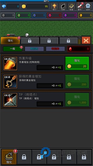 2、当我们有一定的金币之后,就可以去强化伤害和黄金的增加,以及炮塔点的增加;