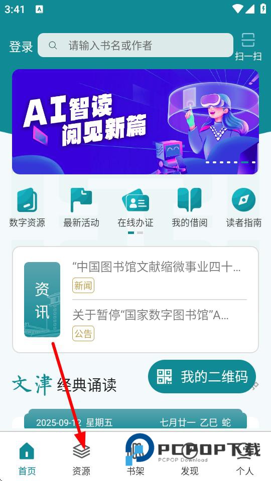 1、打开国家数字图书馆app,点击底部导航栏中的资源选项。