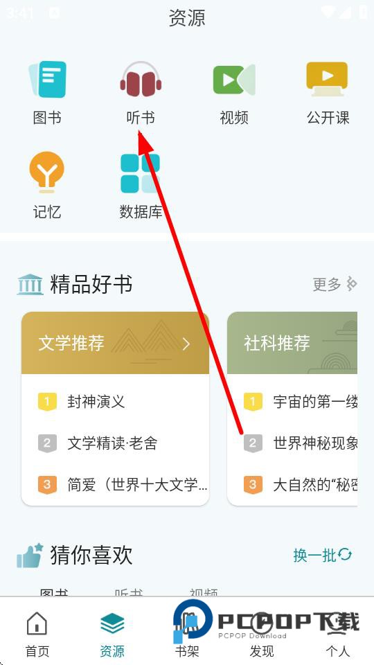 2、进入资源页面后,找到并点击听书图标进入听书资源界面。