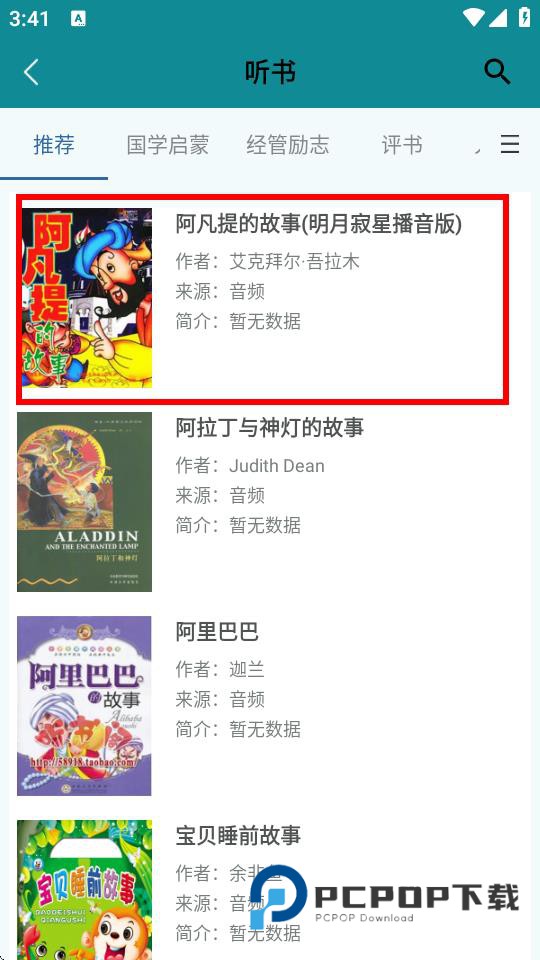 3、在听书界面浏览各类听书资源,比如阿凡提的故事,阿里巴巴等,选择想听的书籍。