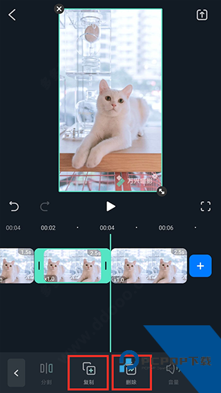 2、点击选中视频片段,在底部工具栏中选择“删除”,删除此段视频