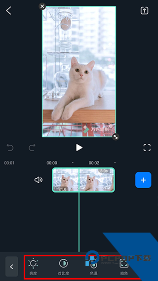 点击底部“调节”选项,在这里可以通过移动滑竿调节视频画面的亮度、对比度、色温、暗角、饱和度这几项画面参数,选择“应用到全部”将效果应用于全部视频片段中。