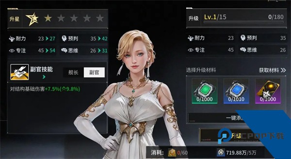 点击右上角的加号图标,可对船员进行升级或升星以提高船员属性。升级需要消耗作战数据。作战数据分为三种品质,品质越高,使用时给船员增加的经验值越多。所有船员初始星级一致,可以通过升星系统提升至最大星级。