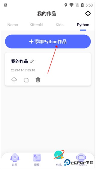 1、用户可以在应用的【我的作品】模块下的Python页面中点击【添加Python作品】按钮