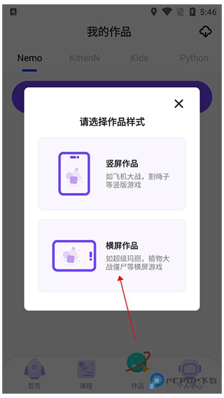 2、然后按照新打开的页面指示,选择【横屏作品】进行点击
