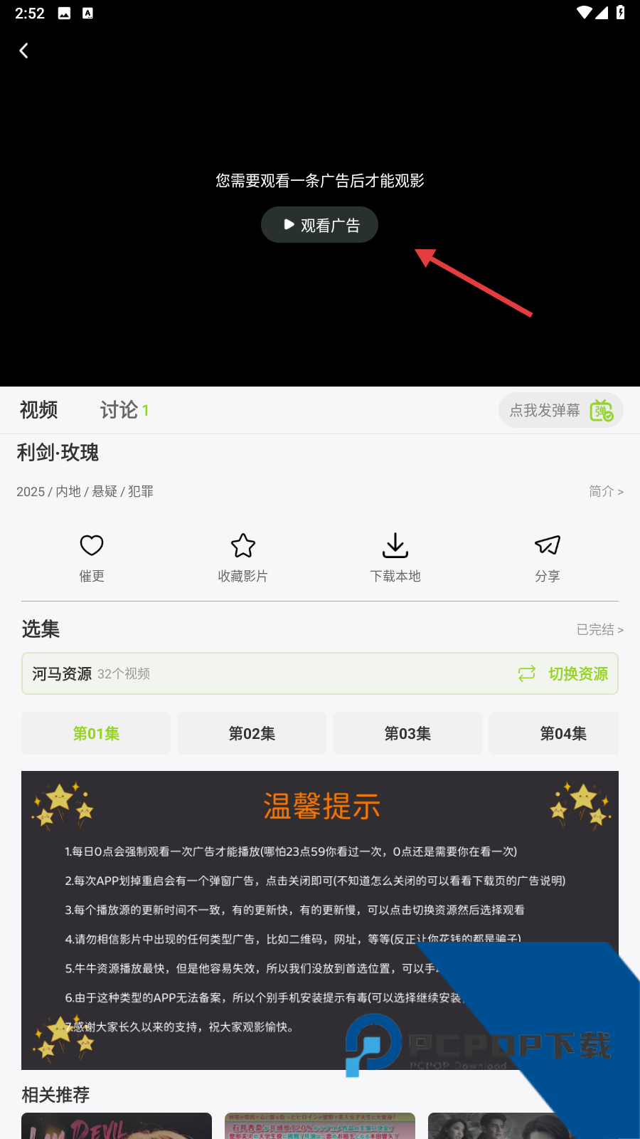 3、播放视频前,若需广告解锁,点击【观看广告】按钮,完成广告播放后即可开始观影。