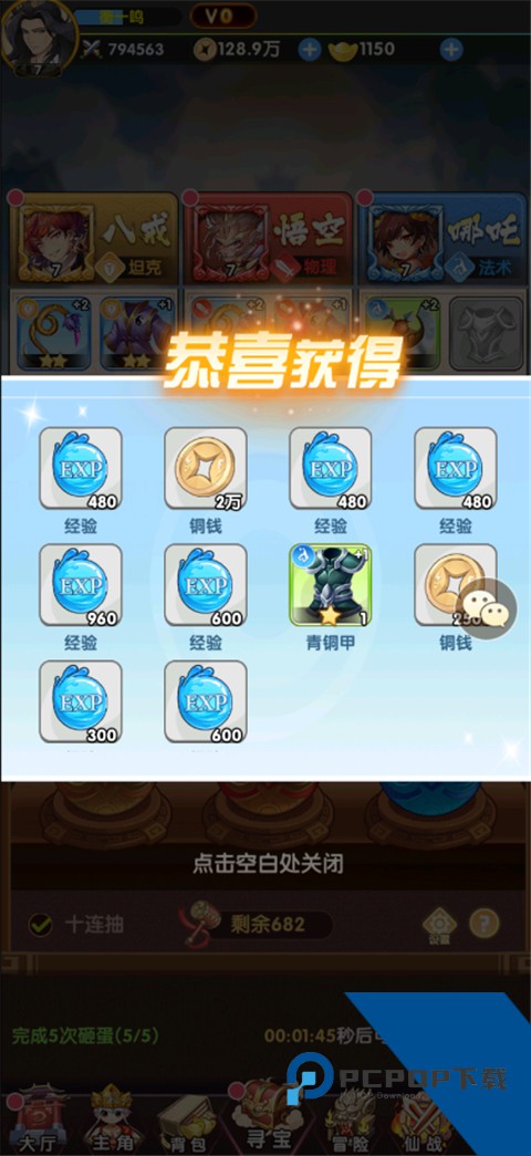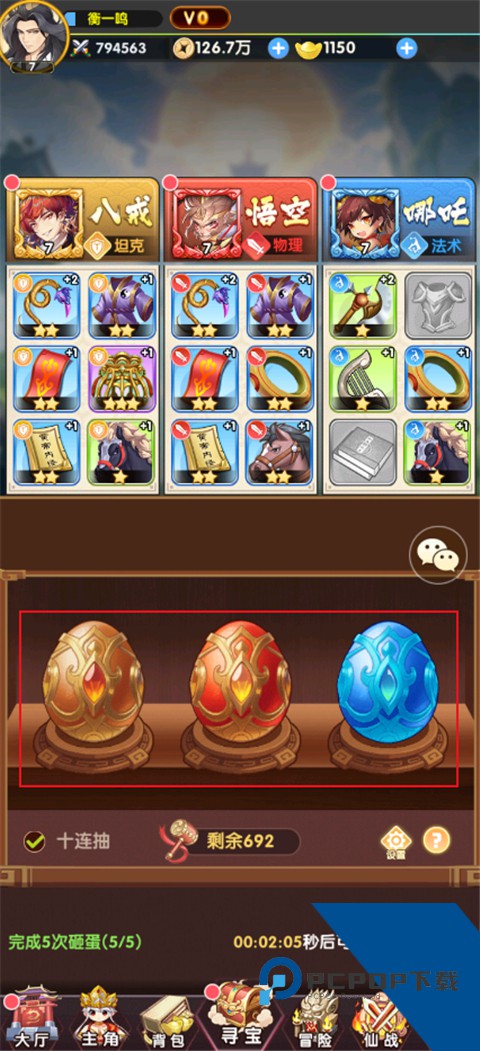 2、点击敲打角色下方的金蛋获取装备、经验等资源;
